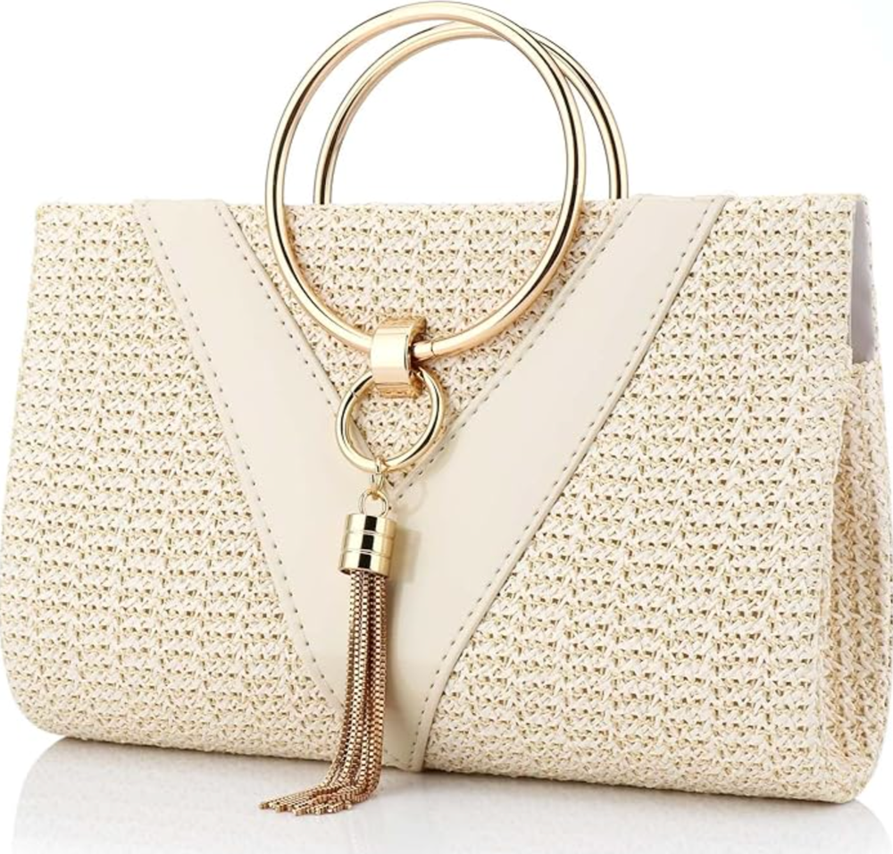 This bag is a spring wedding favorite because it combines a formal clutch shape with casual, woven straw materials. The oversized bow detail adds a feminine touch that pairs beautifully with floral guest dresses and garden party attire.