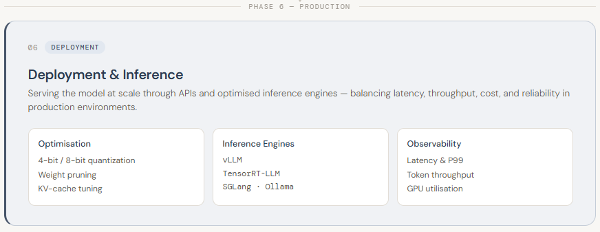 To make deployment efficient, several optimization and serving techniques are used. Models are often quantized (e.g., reduced from 16-bit to 4-bit precision) to lower memory usage and speed up inference. Specialized inference engines like vLLM, TensorRT-LLM, and SGLang help maximize throughput and reduce latency. Deployment can be done via cloud-based APIs (like managed services on AWS/GCP) or self-hosted setups using tools such as Ollama or BentoML for more control over privacy and cost. On top of this, systems are built to monitor performance (latency, GPU usage, token throughput) and automatically scale resources based on demand. In essence, deployment is about turning a trained LLM into a fast, reliable, and production-ready system that can serve users at scale.