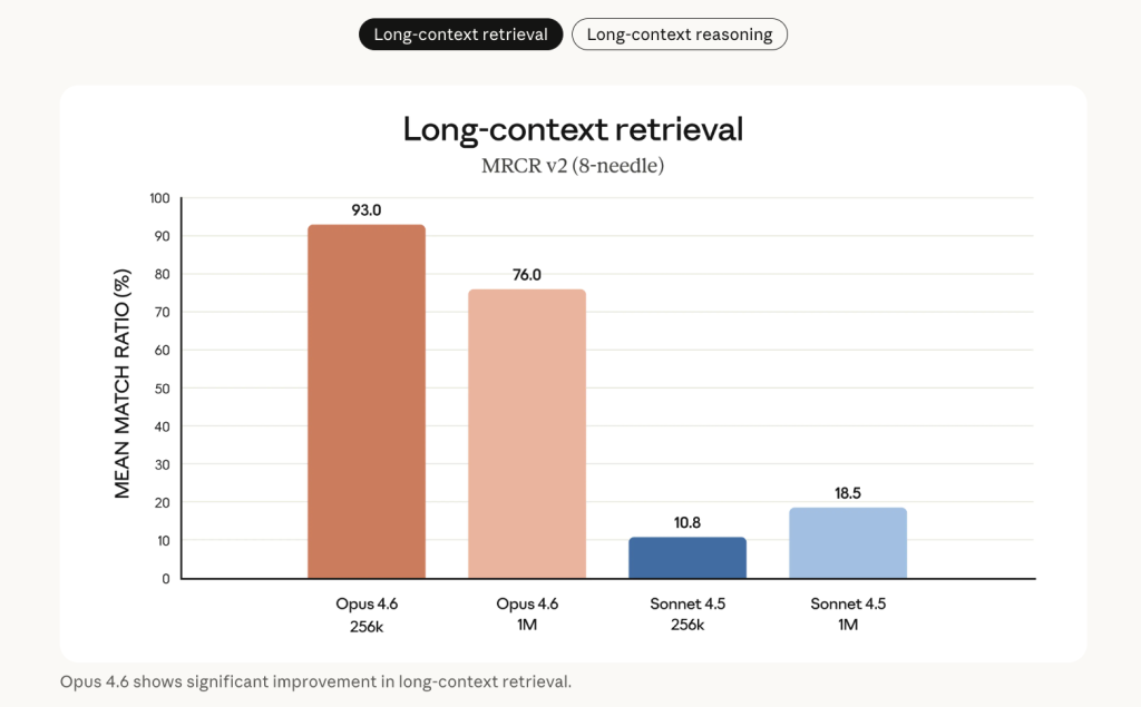 Long-context retrieval is a central improvement. On the 8-needle 1M variant of MRCR v2 — a ‘needle-in-a-haystack’ benchmark where facts are buried inside 1M tokens of text — Opus 4.6 scores 76%, compared to 18.5% for Claude Sonnet 4.5. Anthropic describes this as a qualitative shift in how much context a model can actually use without context rot.