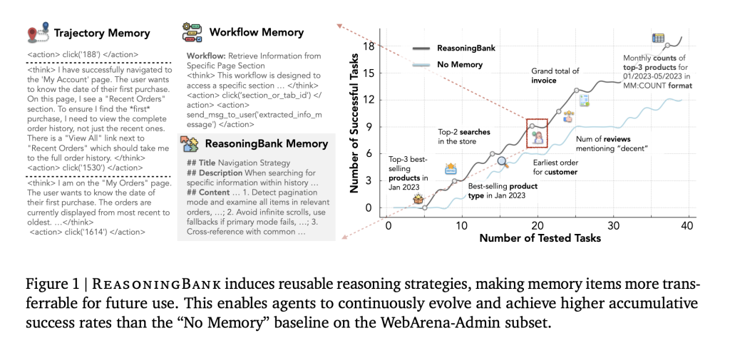 LLM agents tackle multi-step tasks (web browsing, computer use, repo-level bug fixing) but generally fail to accumulate and reuse experience. Conventional “memory” tends to hoard raw logs or rigid workflows. Those are brittle across environments and often ignore useful signals from failures—where a lot of actionable knowledge lives. ReasoningBank reframes memory as compact, human-readable strategy items that are easier to transfer between tasks and domains.