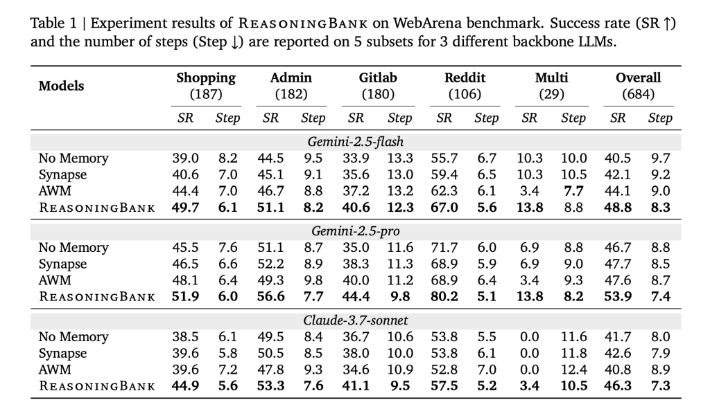 • Effectiveness: ReasoningBank + MaTTS improves task success up to 34.2% (relative) over no-memory and outperforms prior memory designs that reuse raw traces or success-only routines.