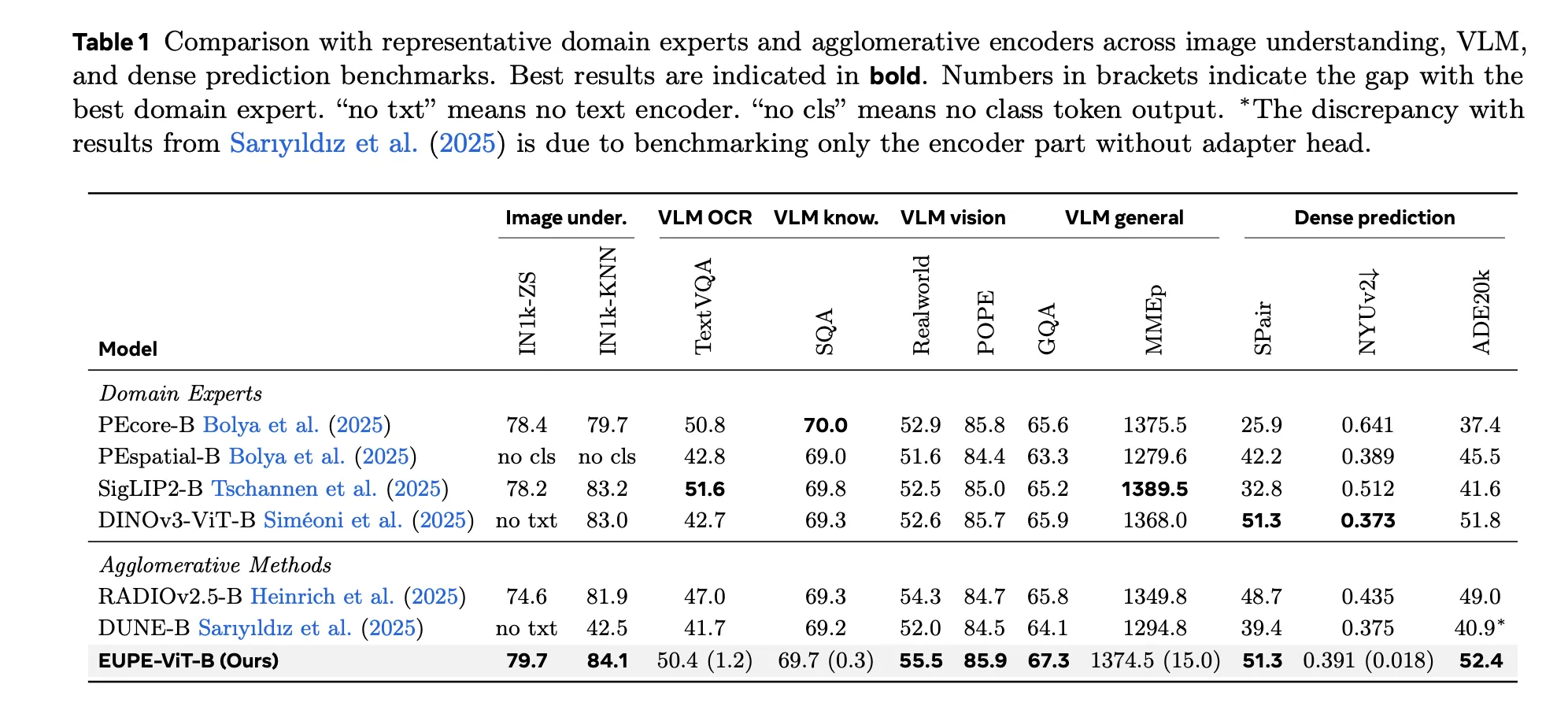 - Vs. agglomerative methods: EUPE outperforms RADIOv2.5-B and DUNE-B on all VLM tasks and most dense prediction tasks by significant margins.