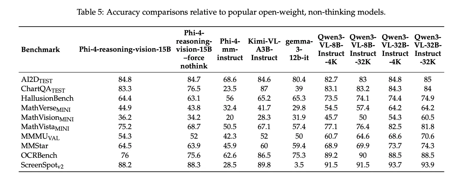 andmodes depending on whether a task needs explicit reasoning or direct perception-based output. - Microsoft’s reported benchmarks show strong performance for its size, including results on AI2DTEST, ChartQATEST, MathVistaMINI, OCRBench, and ScreenSpotv2, which supports its positioning as a compact but capable vision-language reasoning model.