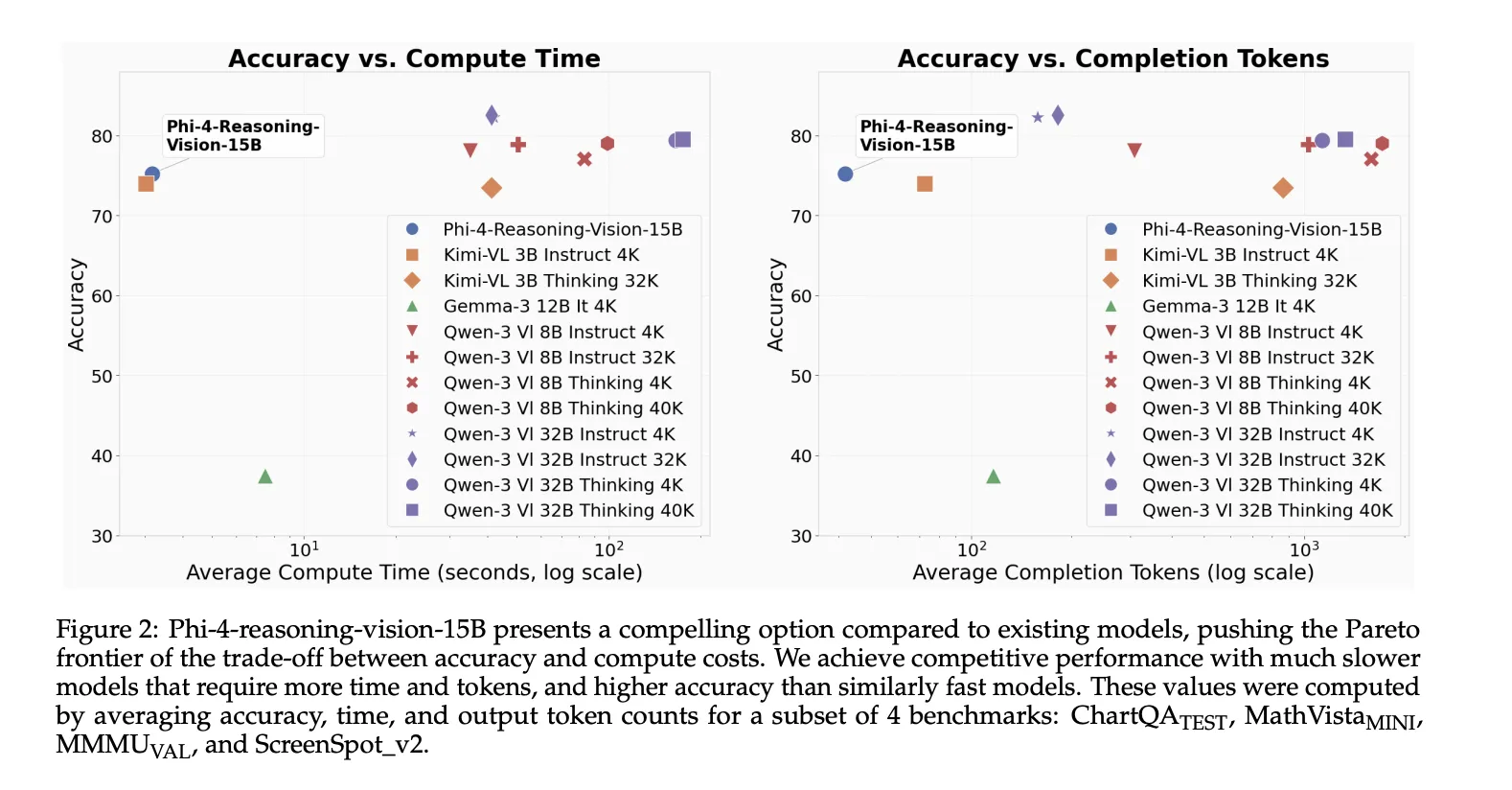A second important design decision is the model’s mixed reasoning and non-reasoning training strategy. Rather than forcing chain-of-thought-style reasoning for all tasks, Microsoft team trained the model to switch between two modes. Reasoning samples include traces, while non-reasoning samples begin with and are used for perception-focused tasks such as captioning, grounding, OCR, and simple VQA. The reasoning data makes up about 20% of the overall training mixture.