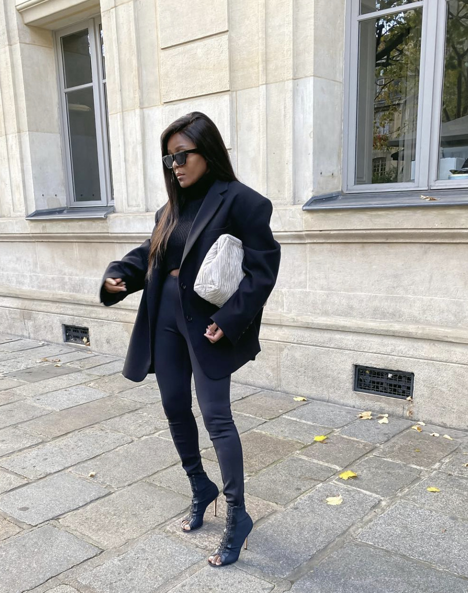 A satin cami under a blazer with tailored pants is the classic day-to-night move that never feels dated. The sheen of the cami softens structured suiting and adds just enough evening energy without looking formal. A small heel lifts the proportions so the blazer reads intentional instead of borrowed from the office chair. This formula works especially well with black, navy, or camel blazers.