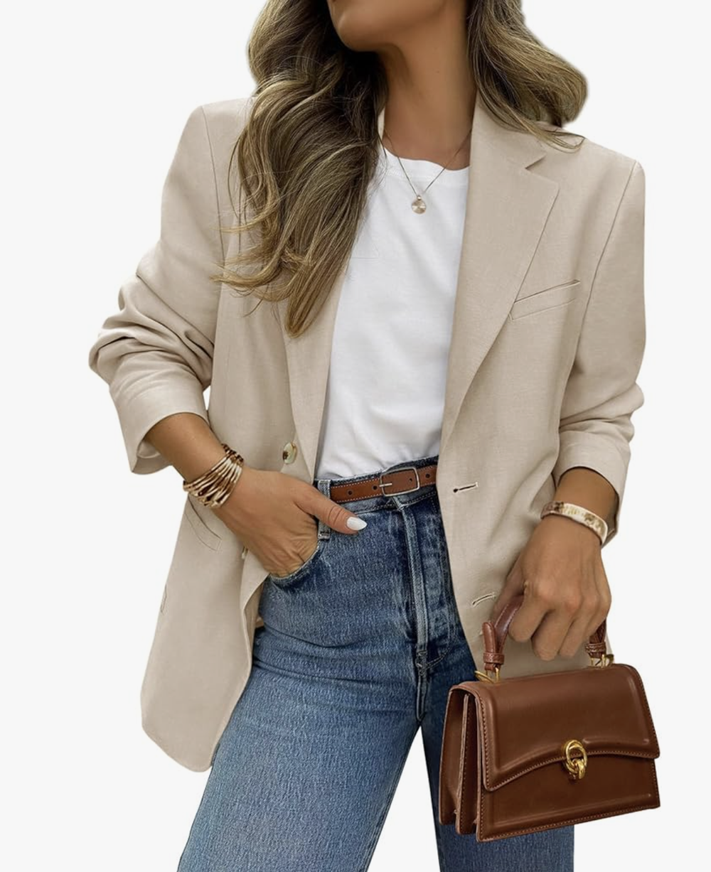 A bodysuit under a blazer with relaxed jeans is the easiest everyday formula because nothing shifts when you move. The bodysuit stays tucked, so the blazer looks neat even after you reach for groceries or wrestle with a crossbody strap. Sneakers keep the outfit grounded in real life instead of business casual territory. This combination is ideal when you want to feel put together without looking like you tried too hard.